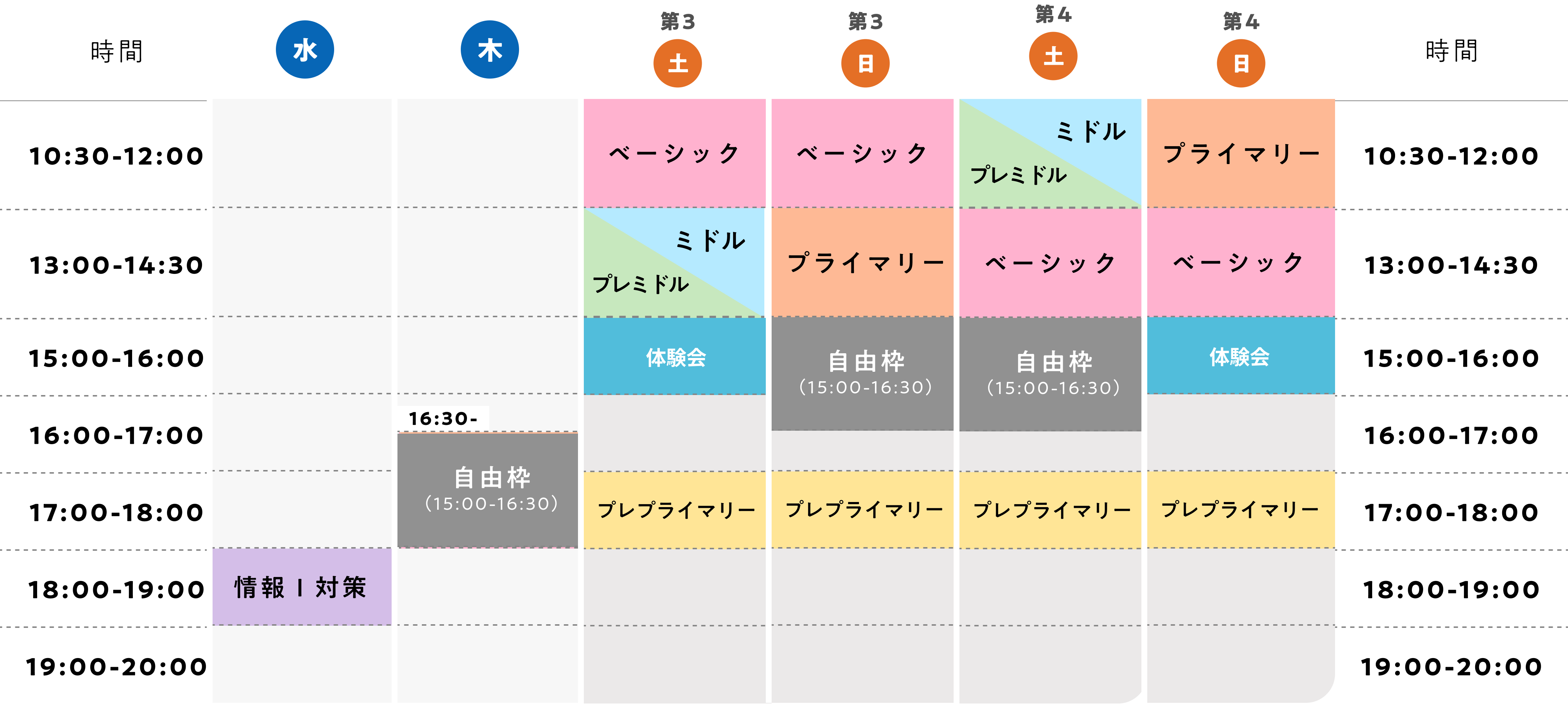 ※自由枠は、プライマリーコース以上(プレプライマリーは対象外)の生徒を対象とした受講枠です。参加はいつでも可能ですが、異なるコースの生徒が一緒になる「コース混合」での実施となるため、通常授業の補完や振替時のご利用を推奨しております。